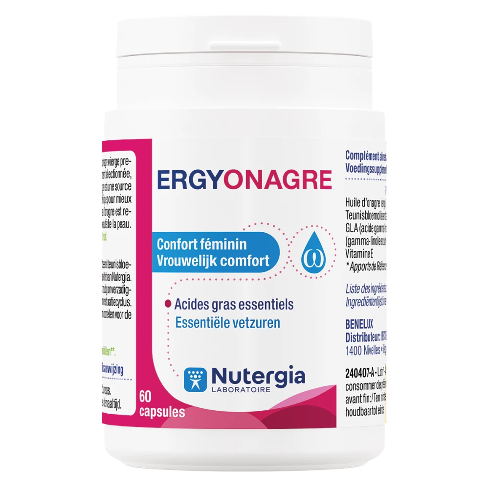 ERGYONAGRE est composée d’une huile d’onagre vierge non raffinée, obtenue par simple pression mécanique à froid, gage de qualité. L’huile conserve ainsi tous les bienfaits de ses constituants et contribue à assurer une prise d’acides gras polyinsaturés bénéfiques pour la femme, en particulier lors de désordres liés au cycle et au niveau cutané. L’effet bénéfique est obtenu pour une consommation de 6000 mg d’huile d’onagre.